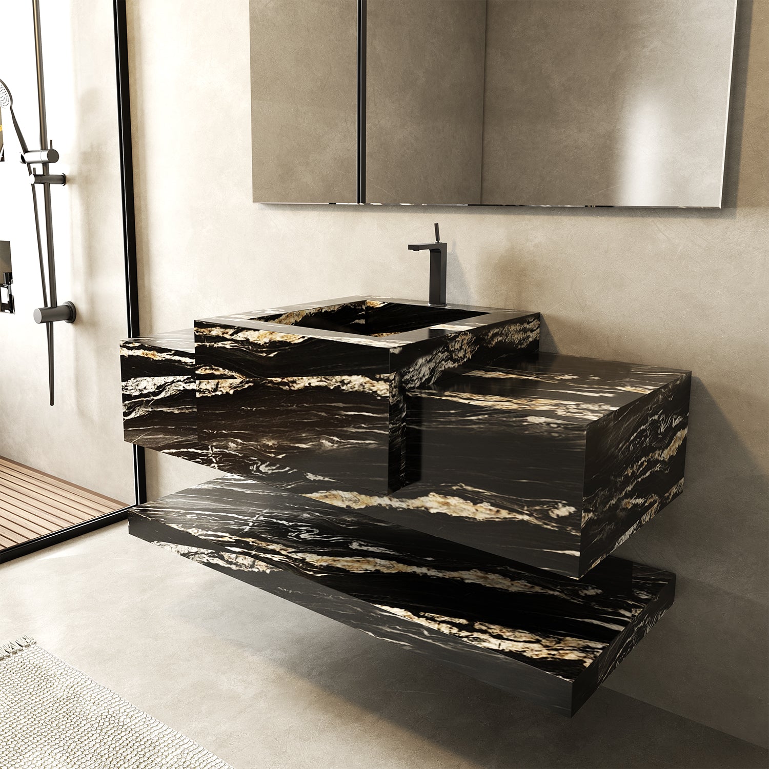 Siyah ve altın renkli detaylarıyla öne çıkan bu lavabo, lüks tasarımıyla banyonuzun göz bebeği olacak.